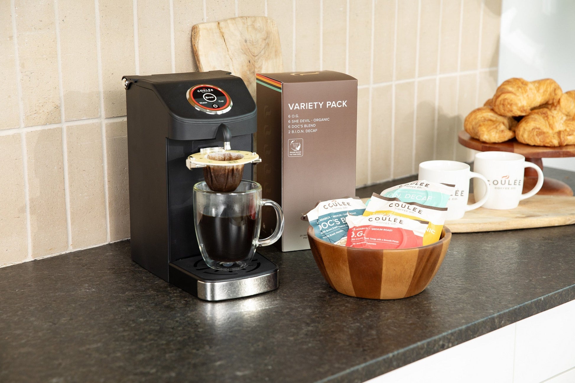 The Coulée SWIRL™ is a stunning, compact system that perfectly captures the pour-over experience with its automated moving swirl arm, perfectly heated water and intelligent water pours. Used with our 100% compostable EcoPour™ filters, Coulée SWIRL provides a superior cup of coffee with the push of a button.